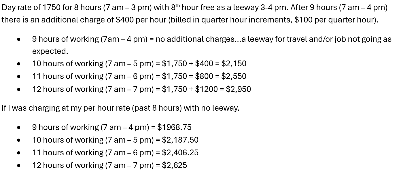 Day Rate = $1,750.00 - (approximately 7:30 am to 3:30 pm. 8 hours is the target time, additional charges after 9 hours of $400/hr)Half Day Rate = $1,050.00 - (approximately 7:30 am to 11:30 am. 4 hours is the target time. If job goes beyond 5 hours, price goes to the day rate)Afternoon Rate - straight $215 per hour if morning is booked by another client (approximately 12:00 pm to 4:00 pm)